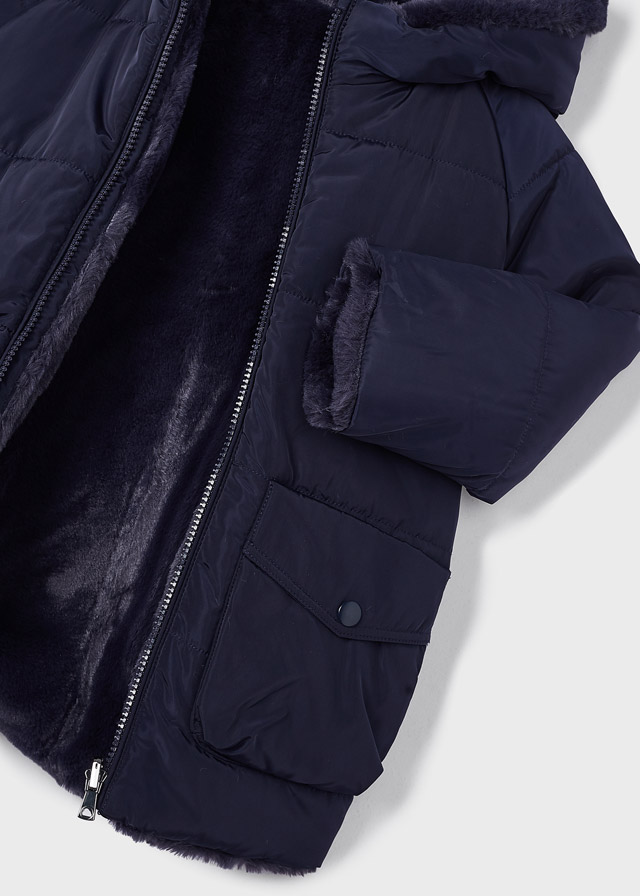 Abrigo acolchado con capucha, reversible interior pelo para mini niña de la marca Mayoral.