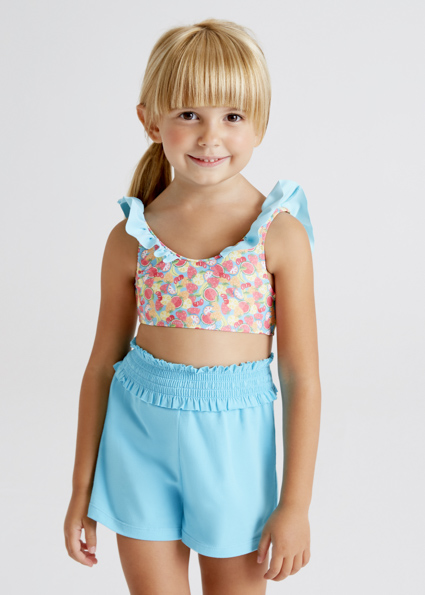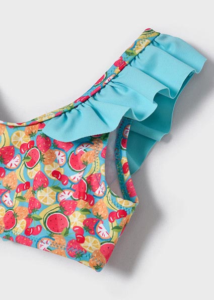 Bikini estampado frutas, espalda en V con volante, para mini niña de Mayoral.