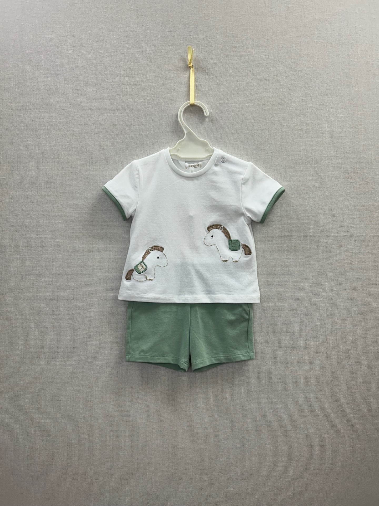Conjunto de algodón, camiseta manga corta blanca y pantalón corto verde agua, para canastilla niño de la marca Mayoral.