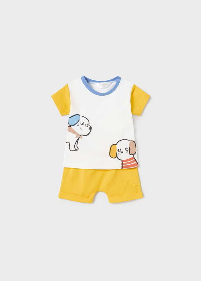 Conjunto de algodón, camiseta manga corta bicolor y pantalón corto amarillo, para canastilla niño Mayoral.