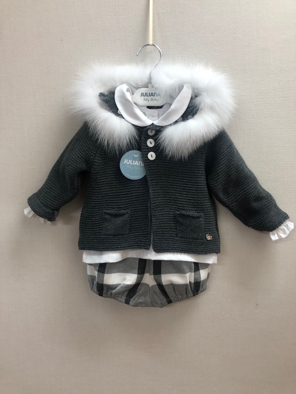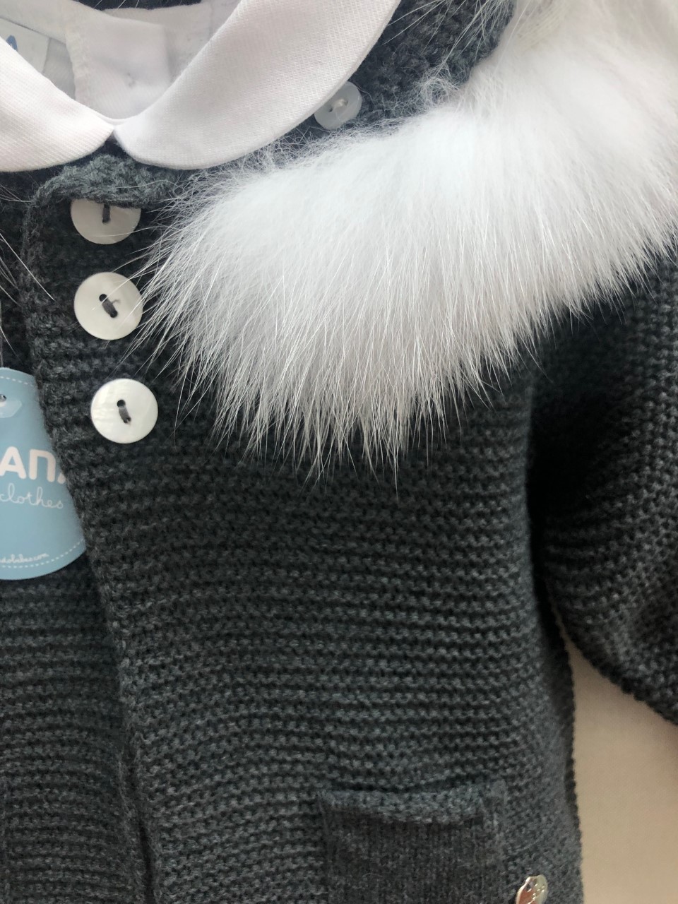 Conjunto 3 piezas, chaqueta gorro con pelo natural en blanco para bebé niño de Juliana.