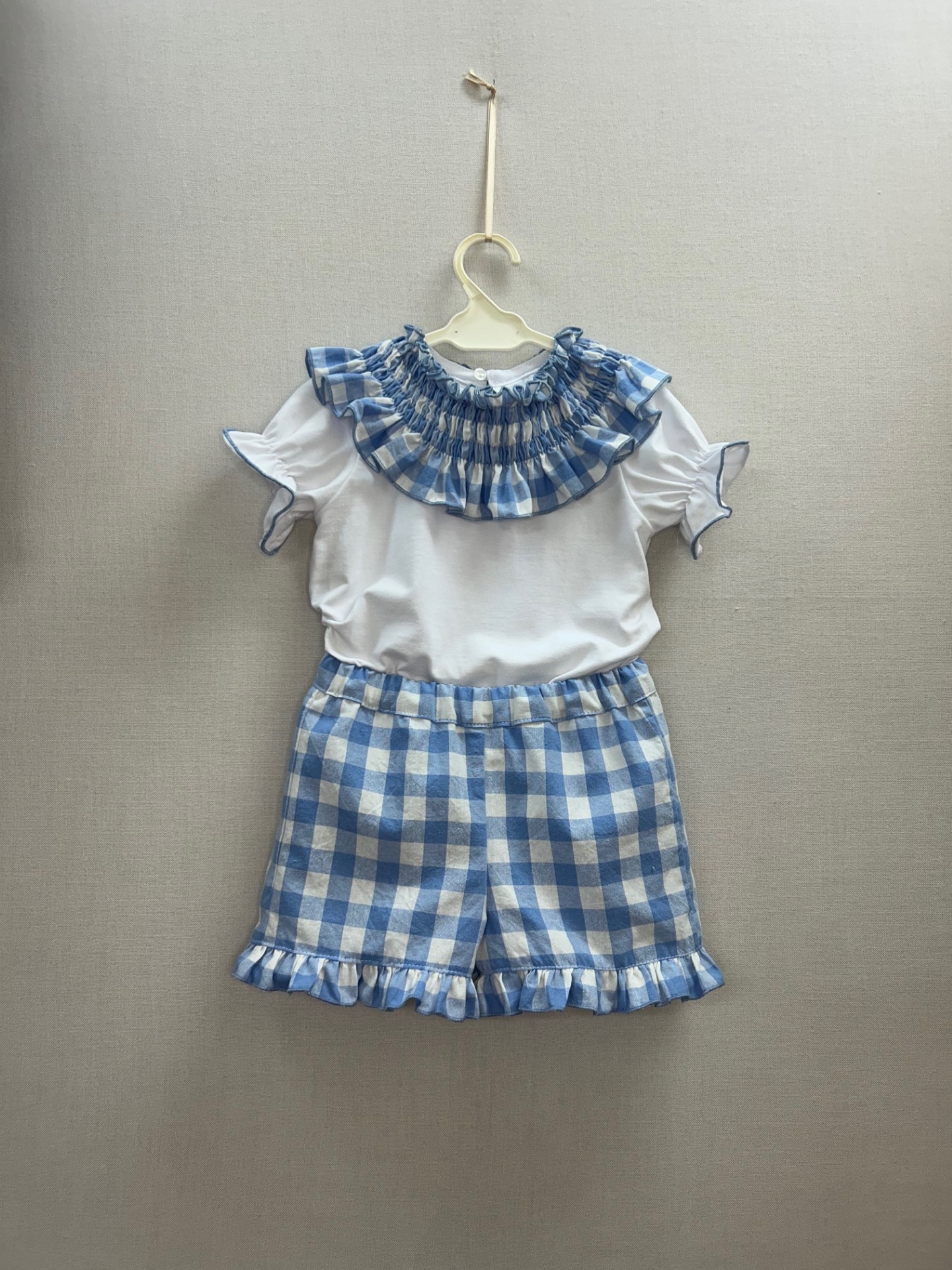 Conjunto camiseta m/c con cuello vichy y pantalón corto a juego para mini niña de la colección «Vichy azul» de Dulce Tiovivo.
