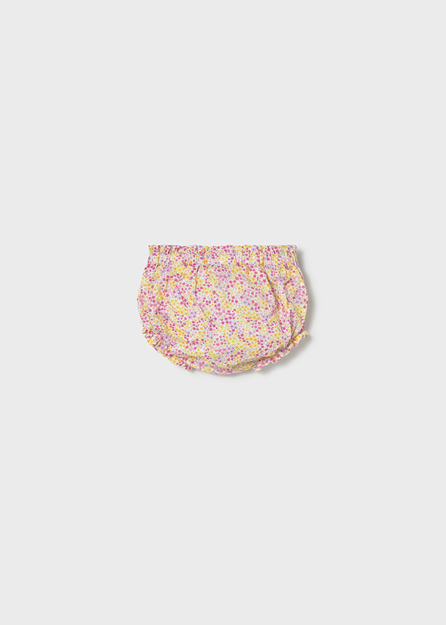 Conjunto 3 piezas, chaqueta tricot amarilla, blusa-camiseta con cuellos blanca y ranita estampada florecitas, para bebé de la colección canastilla niña de Mayoral.