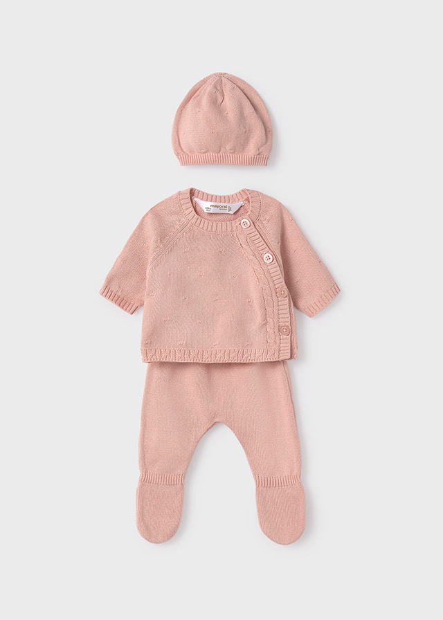 Set regalo tricot, conjunto polaina, jersey y gorrito, para bebé canastilla niña de Mayoral.