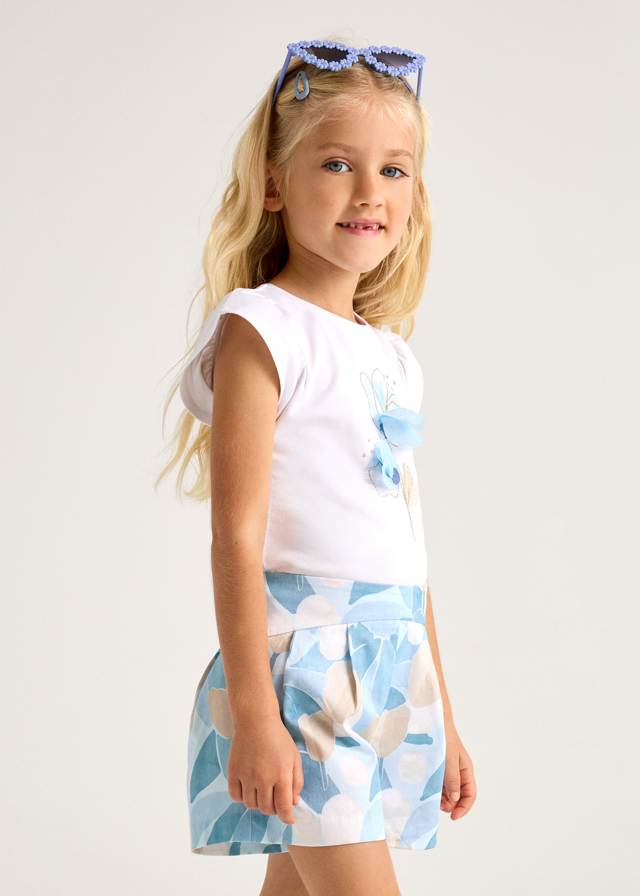 Conjunto falda – pantalón estampado y camiseta m/c flor para mini niña de Mayoral.