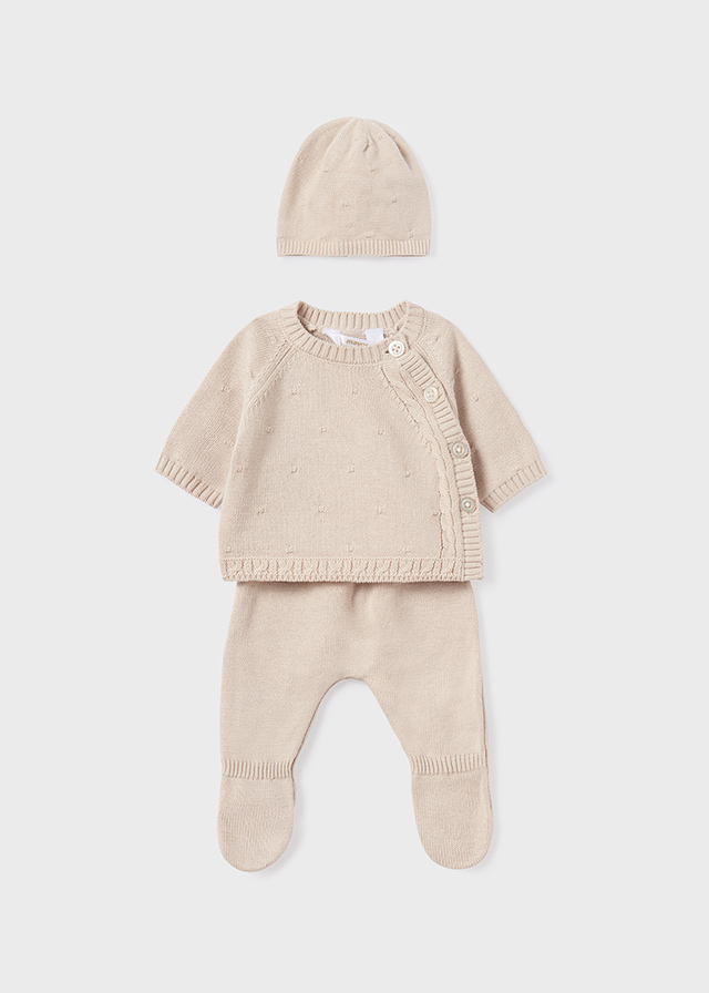 Set regalo tricot, conjunto polaina, jersey y gorrito, para bebé canastilla niño o niña de Mayoral.
