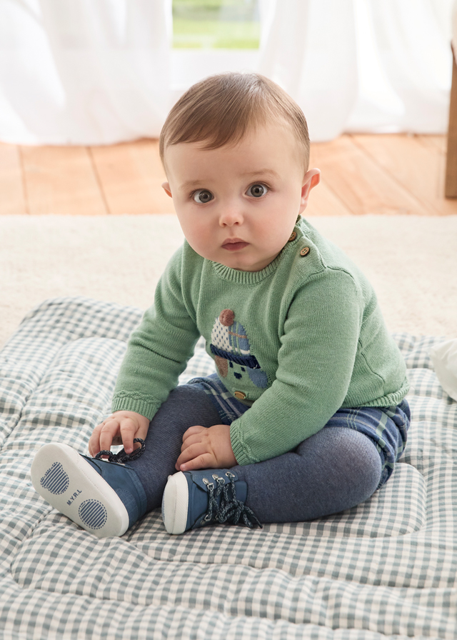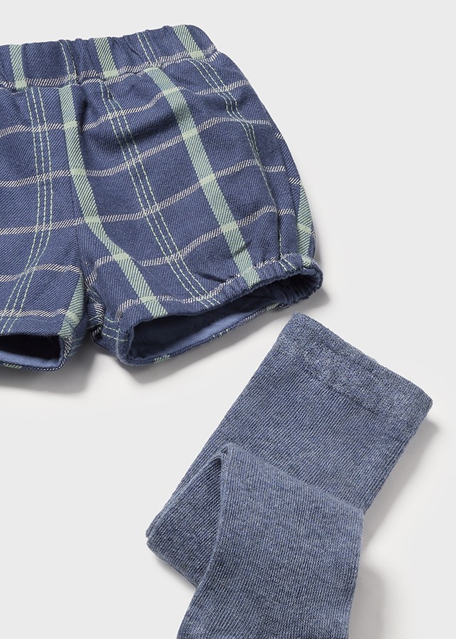 Conjunto 3 piezas, jersey verde, pantalón corto cuadros y leotardo, para bebé niño de la colección canastilla de Mayoral.