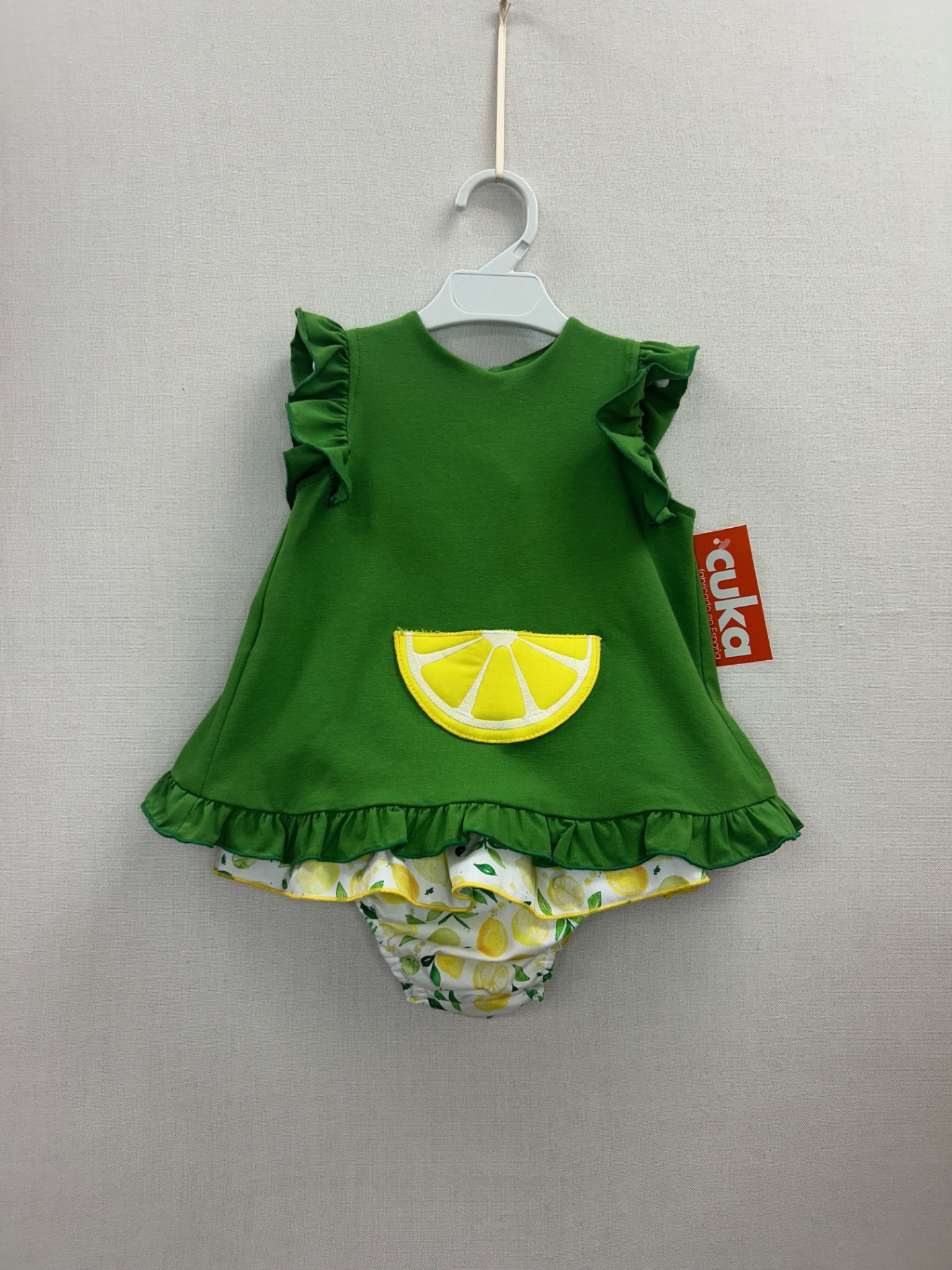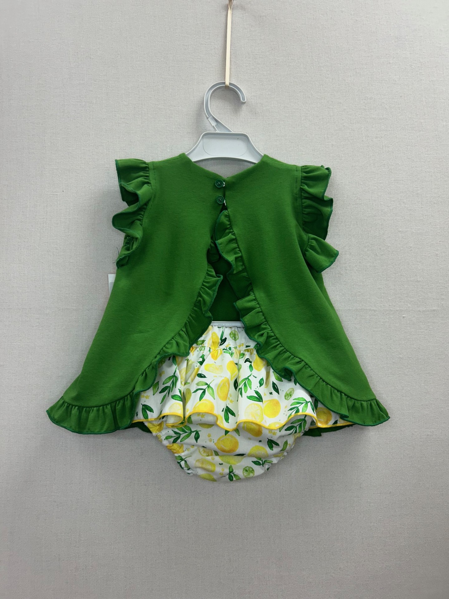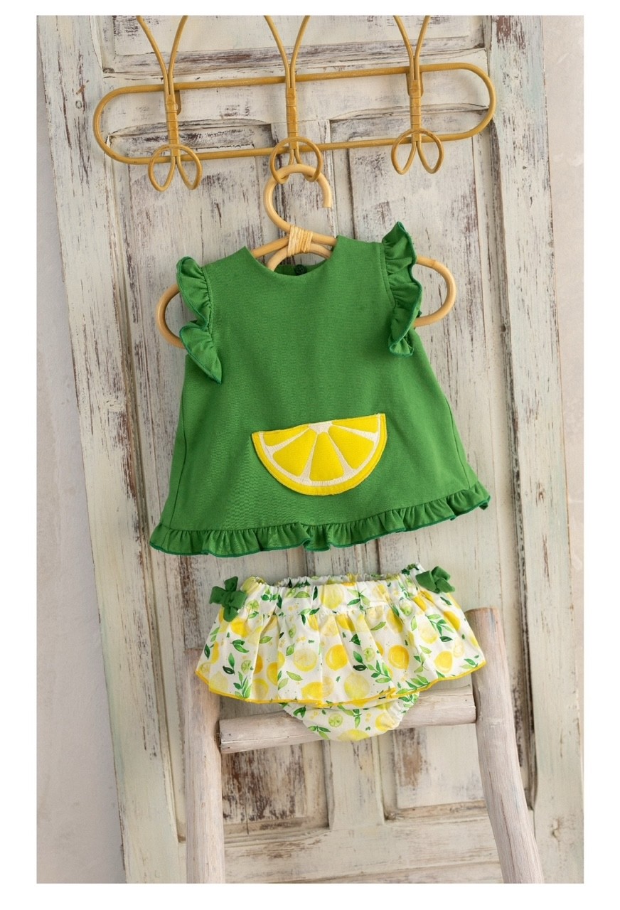 Jesusito algodón verde con braquita estampada, limones, para bebé niña de la colección «Sinimavo Bandaranaike» de Cuka (Basmartí).