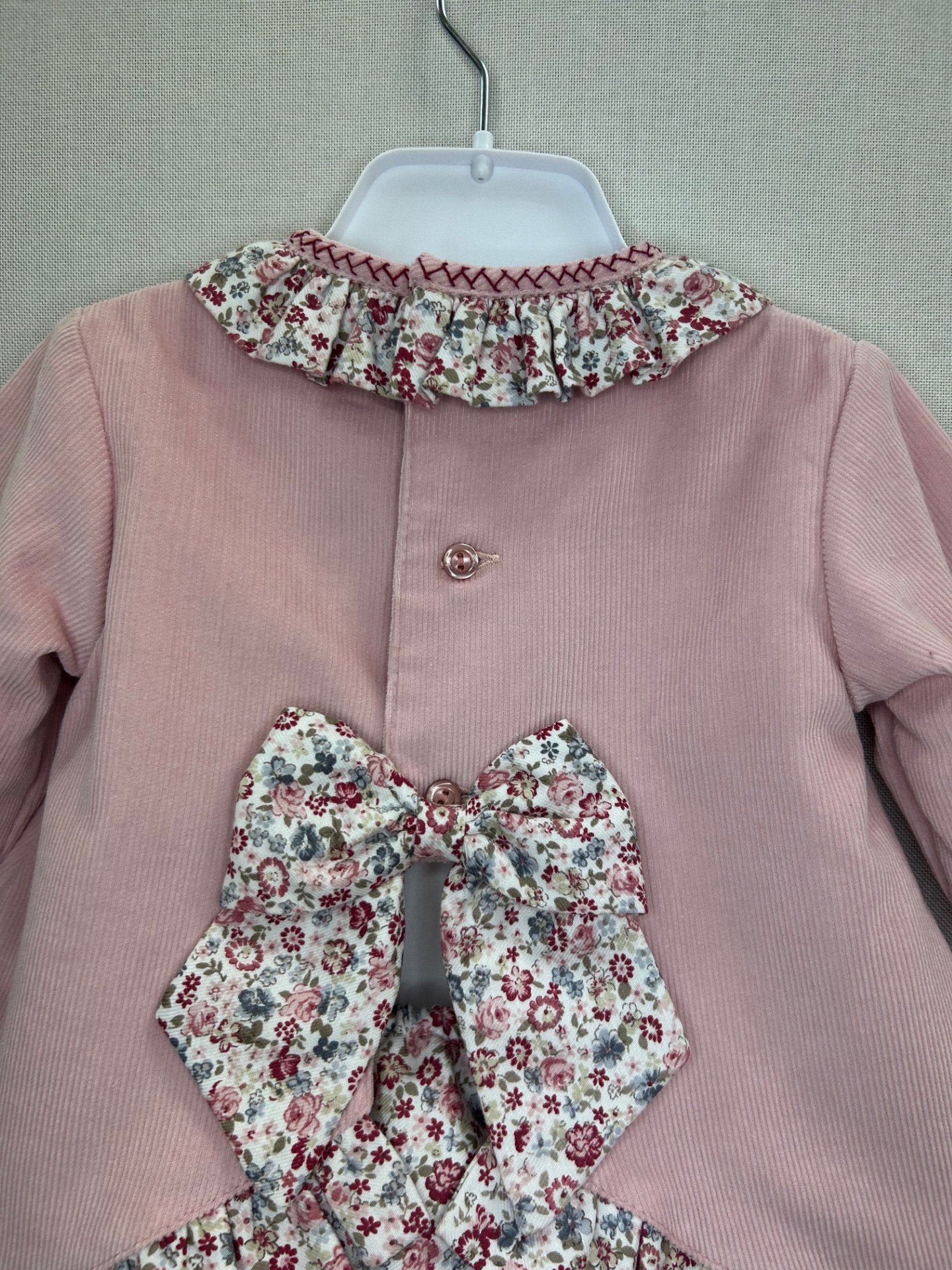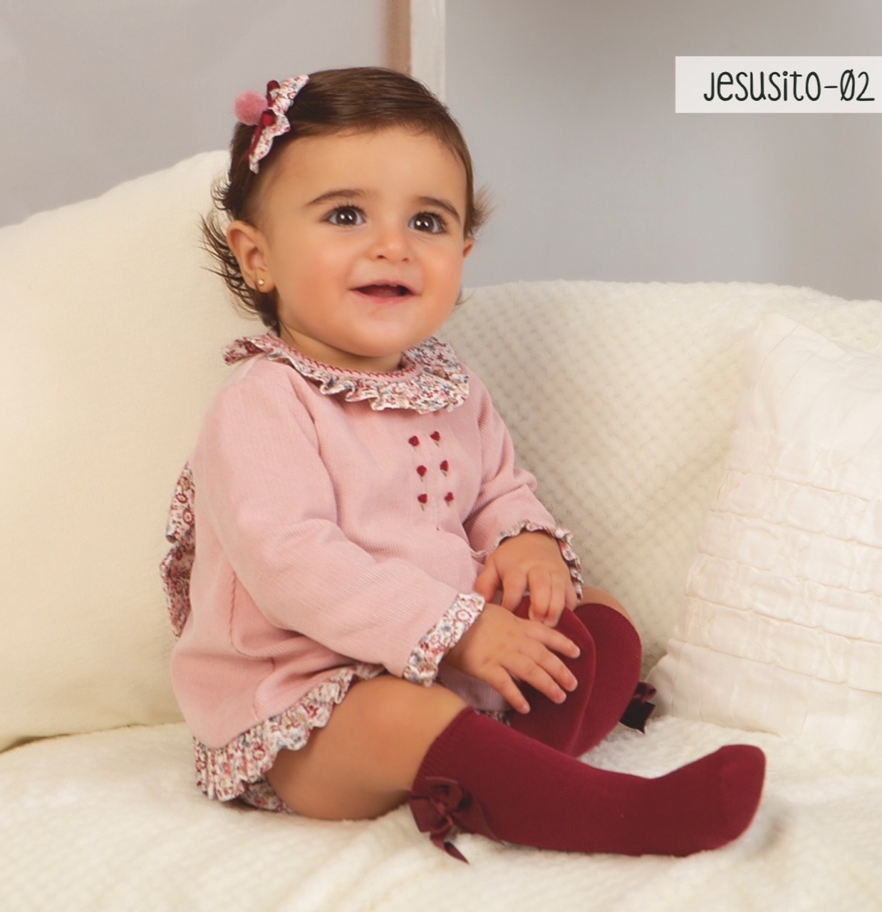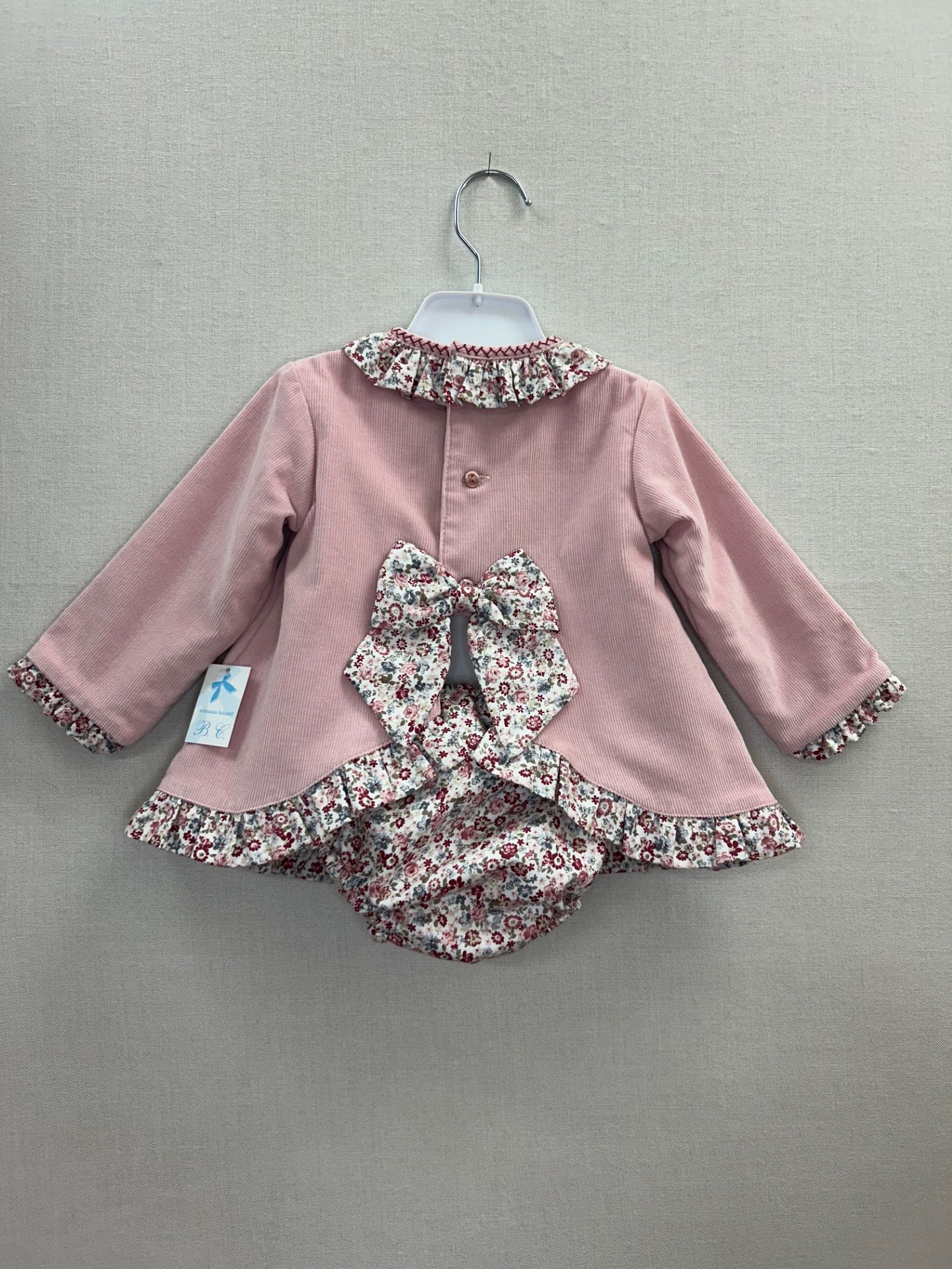Jesusito pana rosa con detalles estampado flores para bebé niña de la colección Artesanía Infantil Belén Costales.