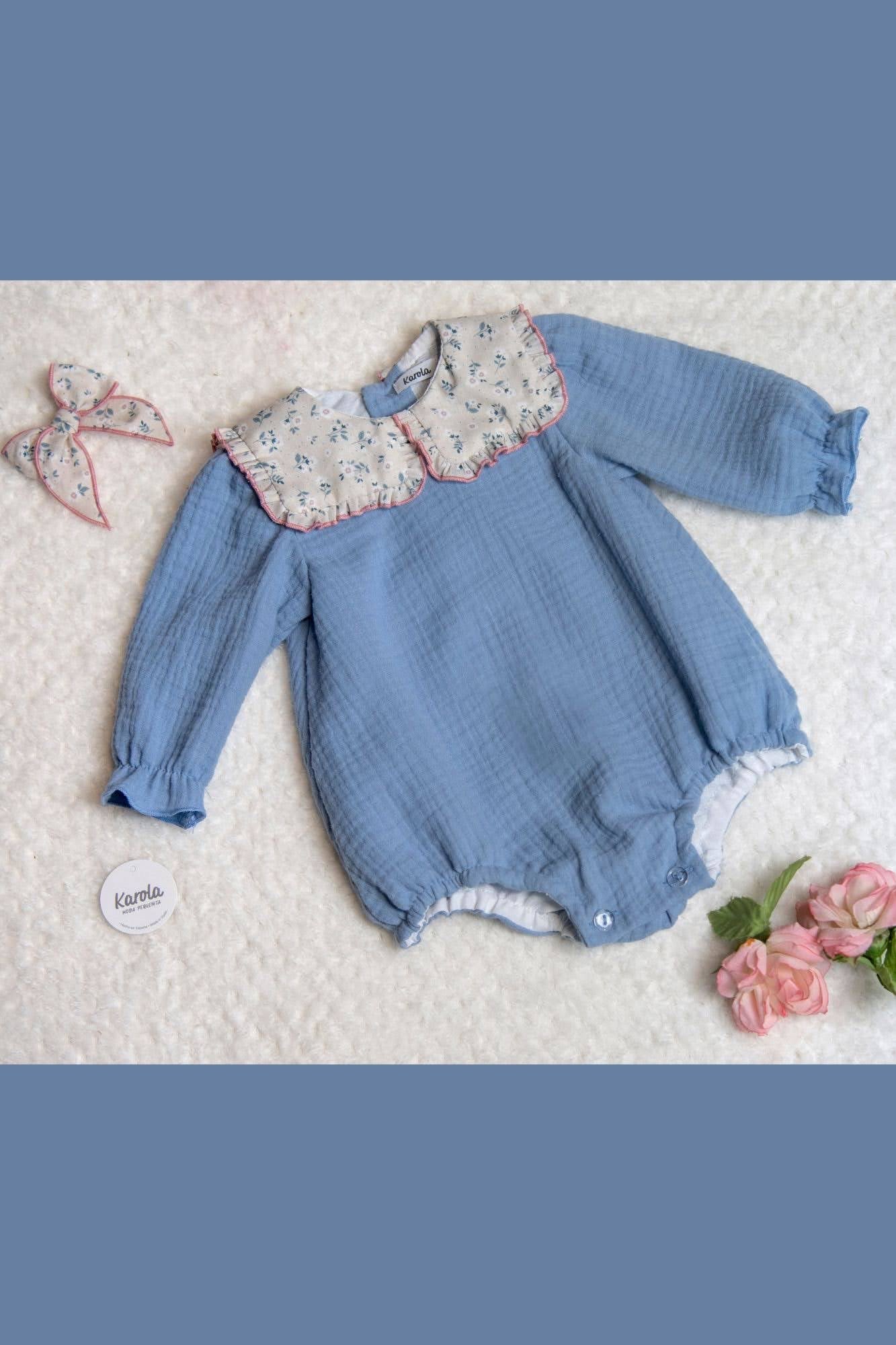 Pelele gasa doble con cuellos estamopado flores para bebé niña de la colección Iris de Karola by Daniesty.
