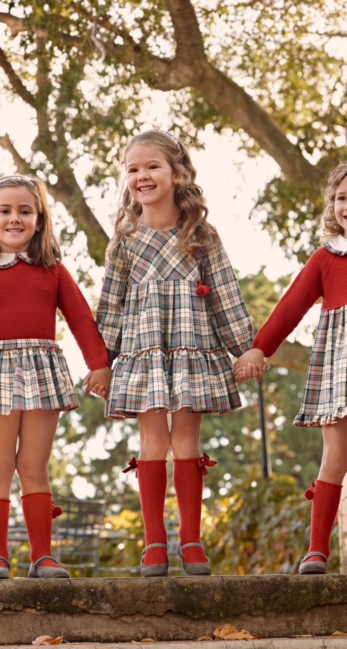 Vestido cuadros volante y pompones para bebé niña de la colección Juliana.