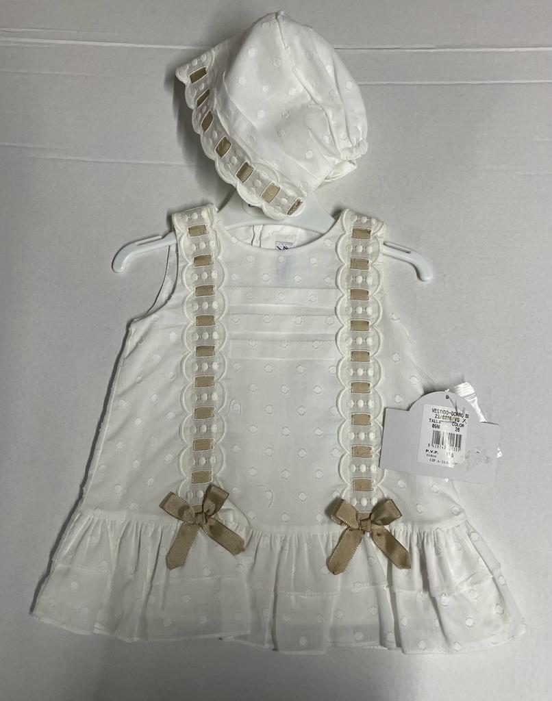 Vestido y capota pasacintas beige para bebé niña de Miranda.