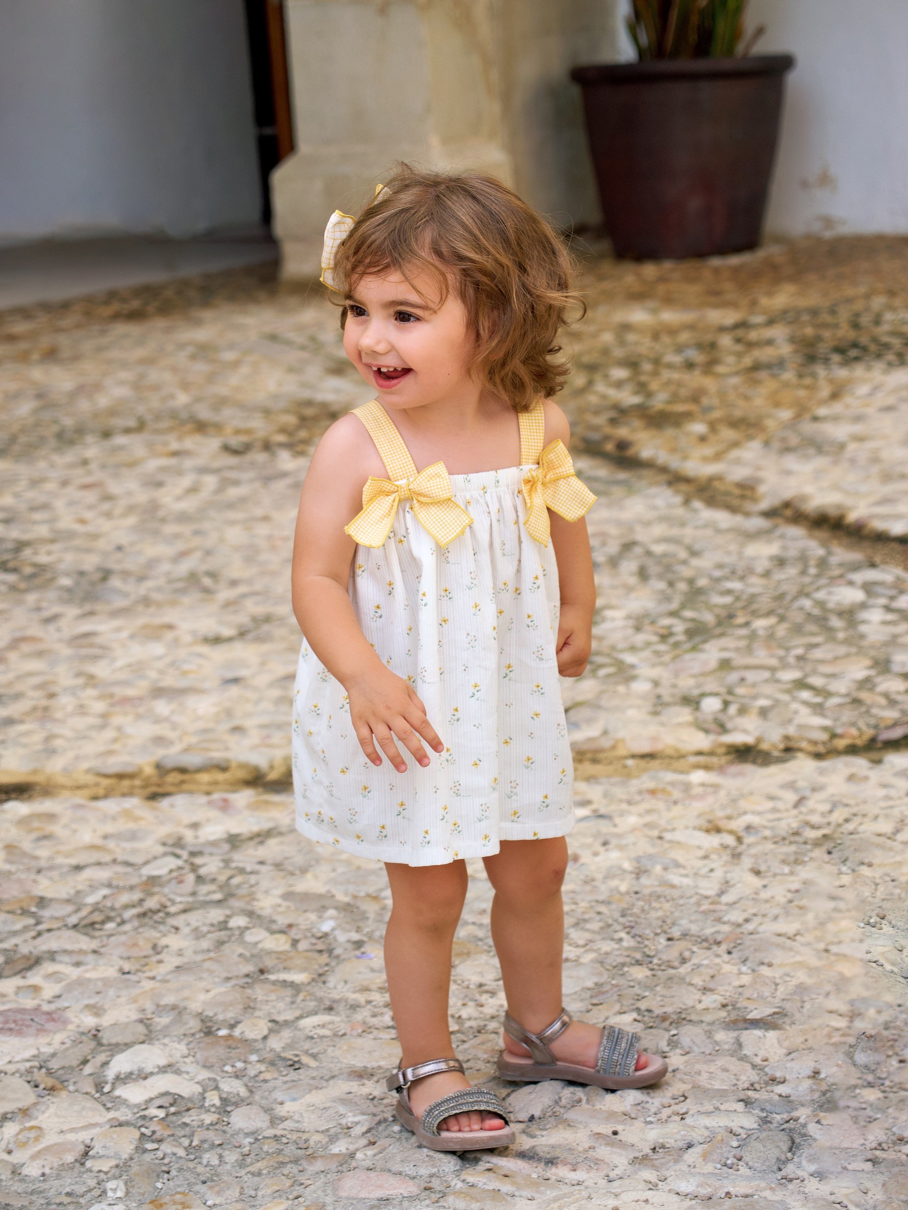 Vestido tirantes combinado vichy y florecitas con braguita cuadros amarillo para bebé niña de Rapife.