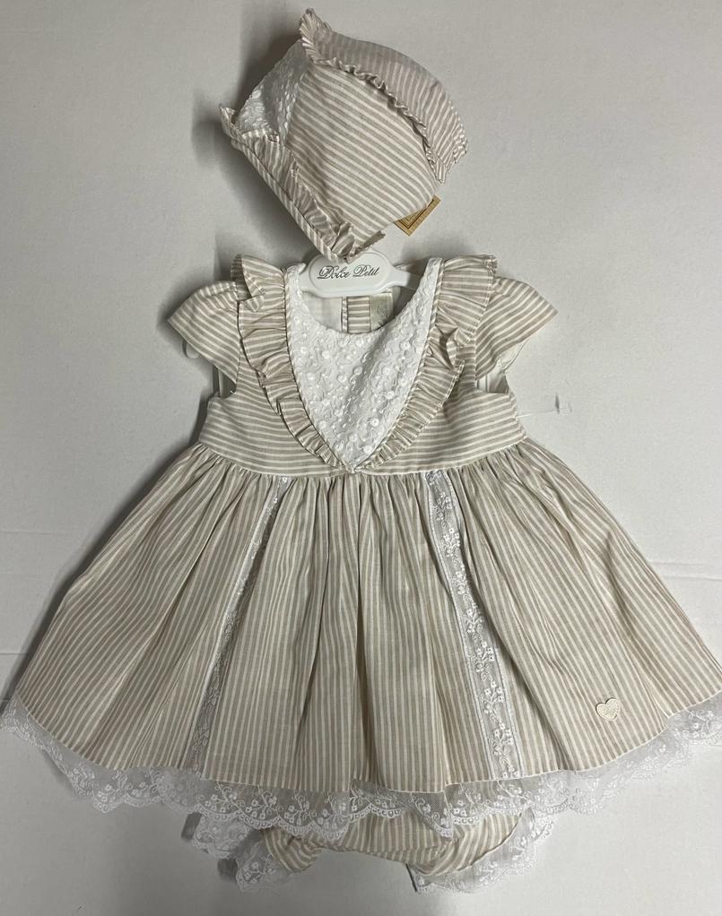 Vestido, braguita y capota rayas beige para bebé niña de la marca Dolce Petit.