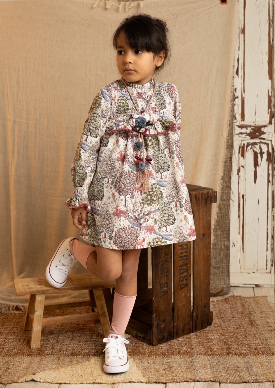 Vestido manga larga estampado bosque con ciervos y pompón rosa para mini niña de la colección «Raymoneda» de Basmartí.
