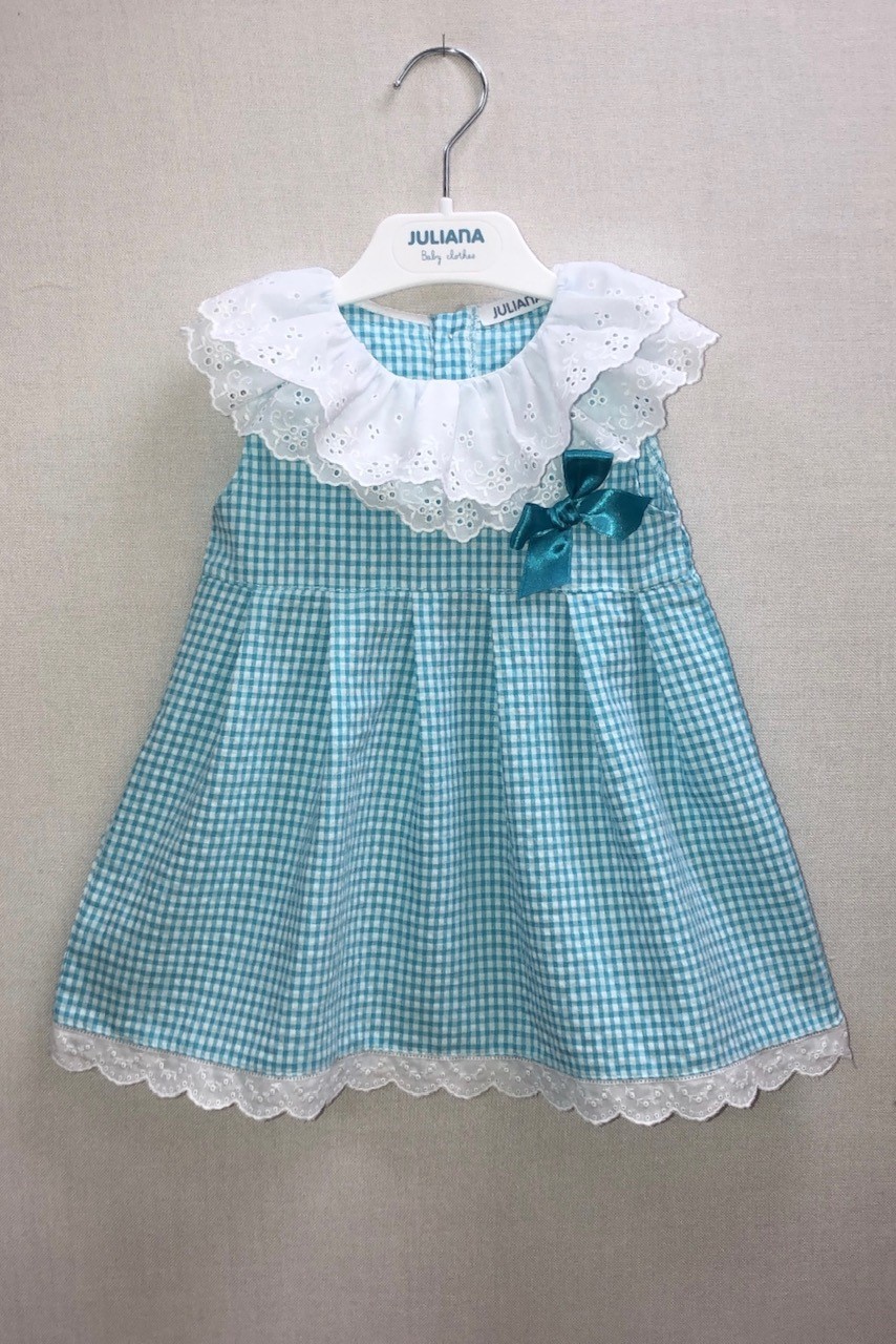 Vestido tela cuadro vichy turquesa con puntilla en blanco para bebé niña de la marca Juliana.