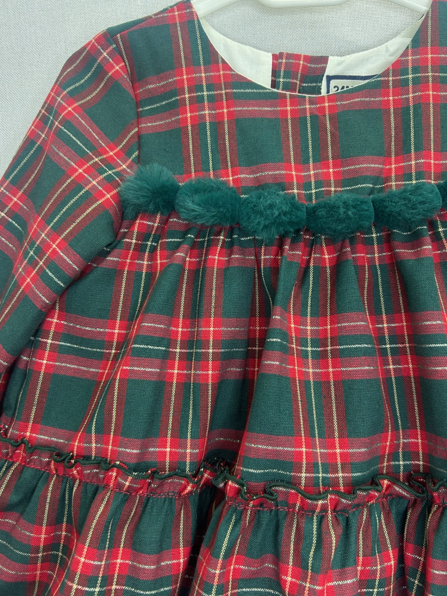 Vestido cuadros navideños con pompones en verde y braguita en rojo a juego para bebé niña de Nekenia.