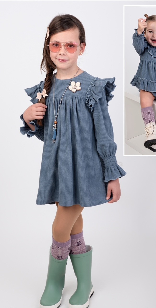 Vestido pana punto con volante en el hombro y detalle flor para mini niña de Vera, Nekenia.